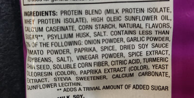 protein blend, vegetable oil, calcium caseinate, corn starch, natural flavors, sugar, psyllium husk, sunflower cream, onion powder, tomato powder, paprika, spice, garlic powder, chia seed, soluble corn fiber, citric acid, turmeric oleoresin, paprika extract, yeast extract, stevia sweetener, calcium carbonate, lecithinCategory