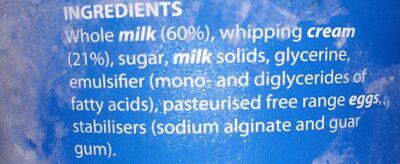 Whole milk (60%), whipped cream (21%), sugar, milk solids, glycerin, emulsifier (mono- and diglycerides of fatty acids), pasteurized free-range eggs, stabilizers (sodium alginate and guar gum)Category